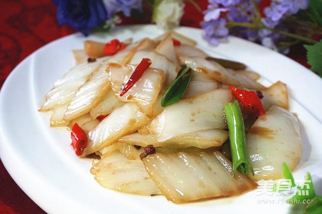 5.依次加入白糖、香醋、老抽、酱油炒匀,继续翻炒至白菜片入味儿