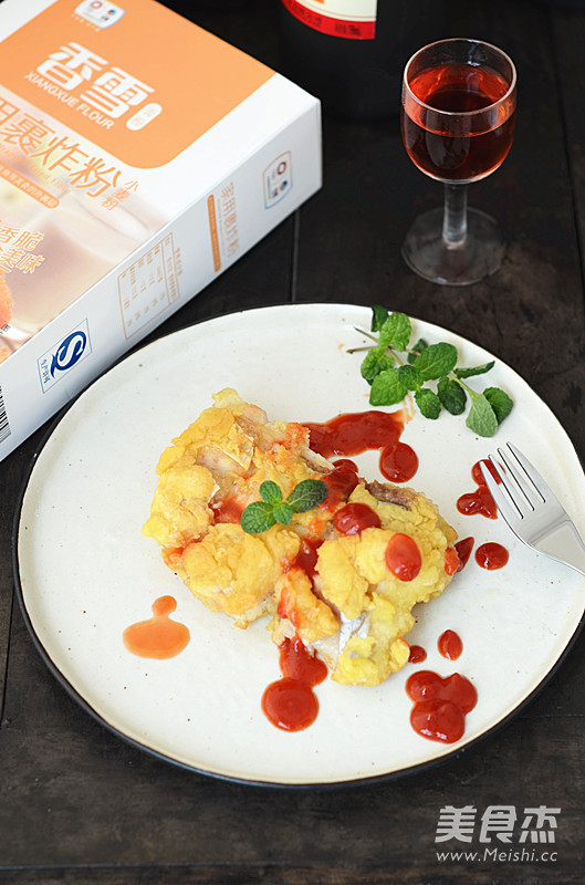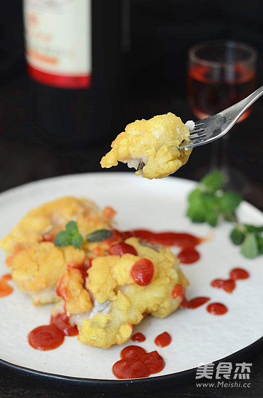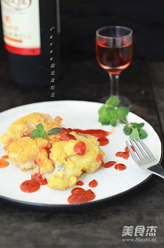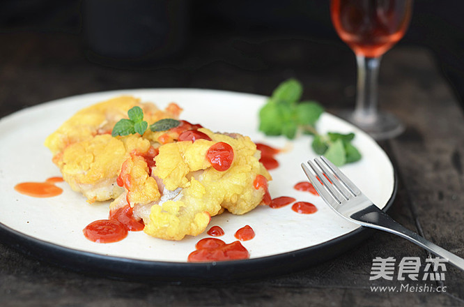 12.炸至两面金黄后盛出,淋番茄沙司即可食用。