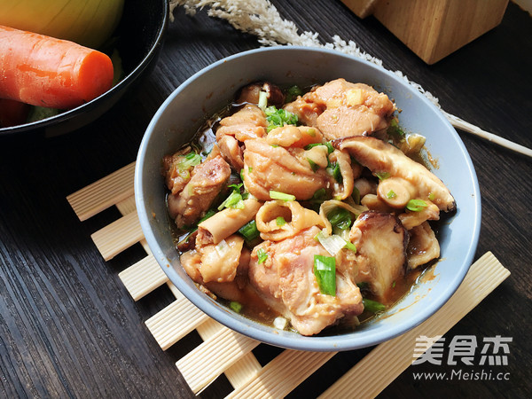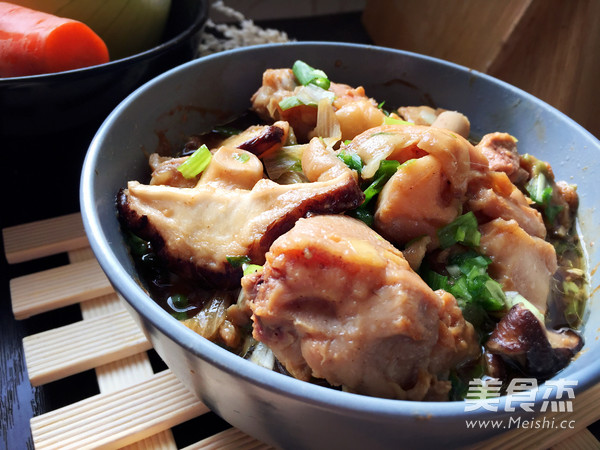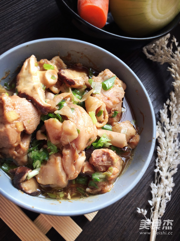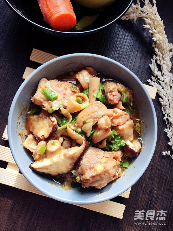 5.快蒸好的时候放上葱末,蒸好后,把鸡块和香菇拌个均匀。就可以上桌咯