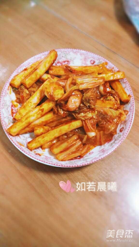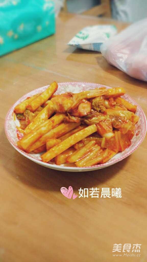 2.热锅放油,依次放入白菜和虾翻炒至白菜断生,然后放入年糕辣酱,白砂糖少许水,不停翻炒即可。