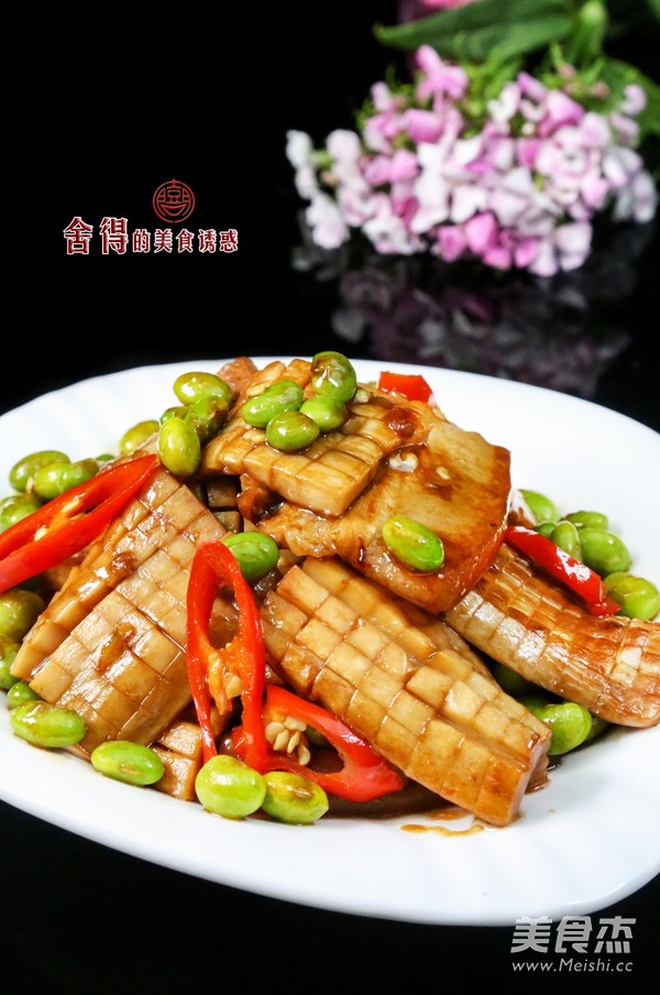 4.五花肉煎好后,加入适量的水,倒入杏鲍菇、青豆,加适量的盐和老抽,盖上锅盖,焖煮3分钟。