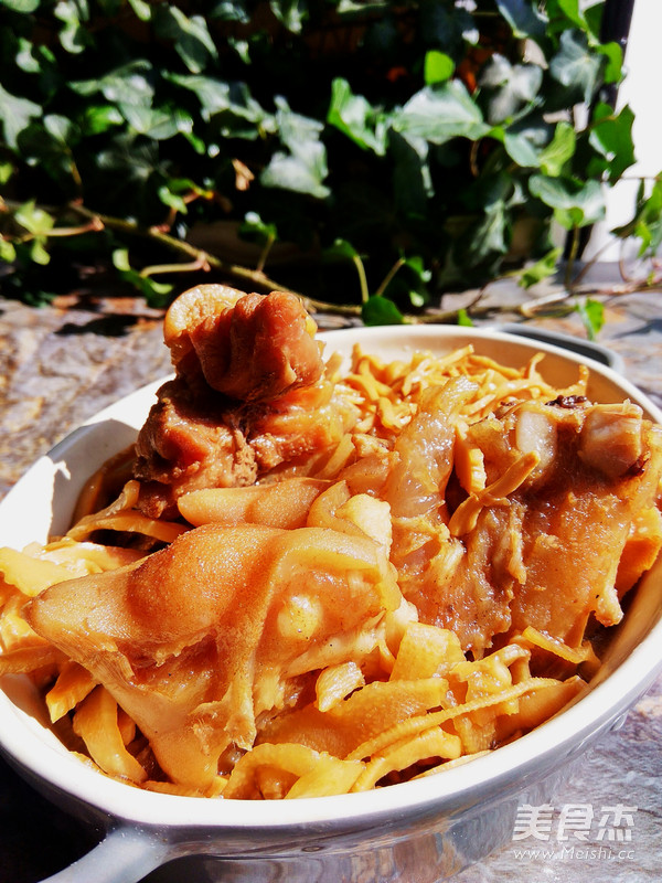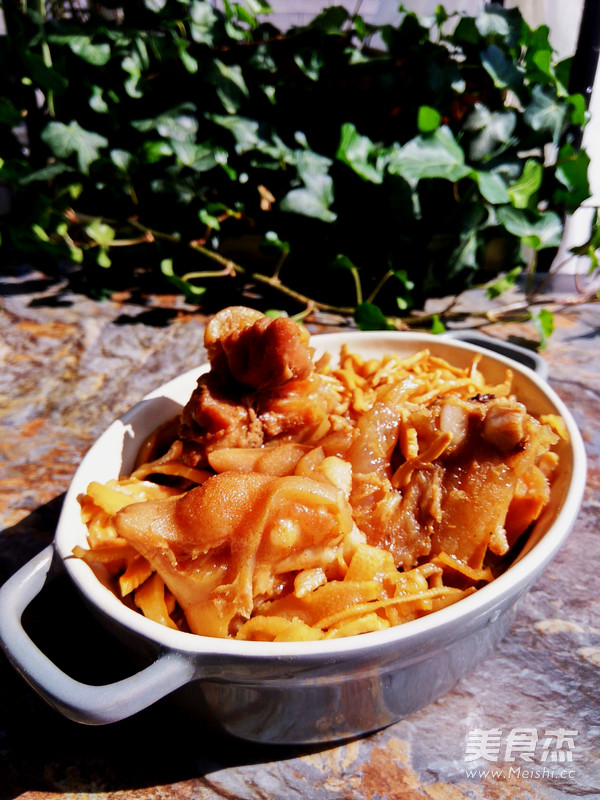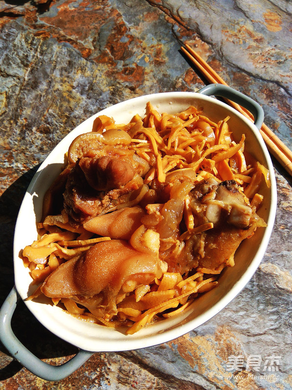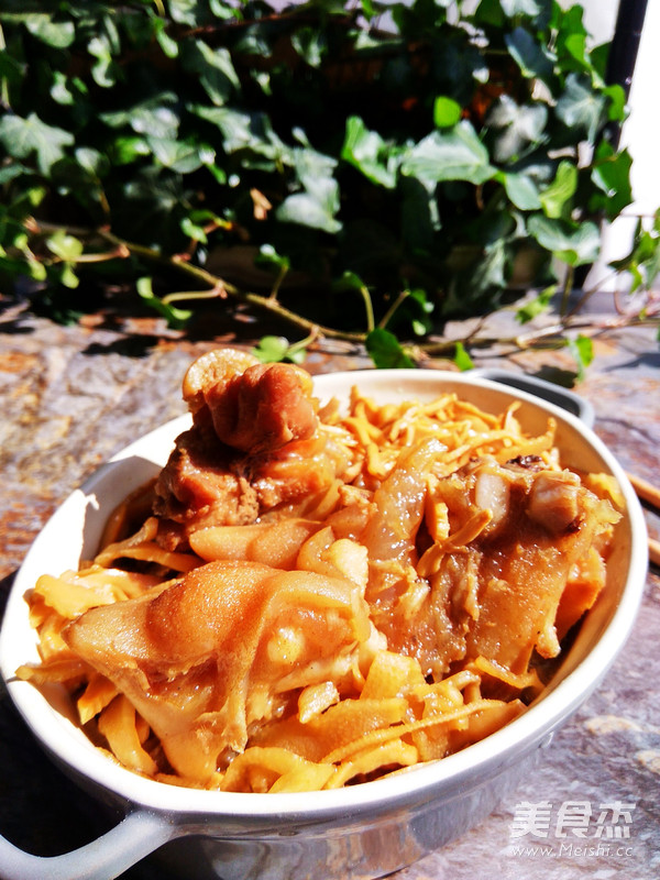 用电压力锅炖猪蹄,既省力又软烂香糯。再移到老铁锅里,用猪蹄的汤汁使笋丝入味,笋丝脆脆的口感和猪蹄的口感正好中和一下,营养也更丰富。
