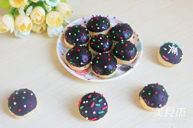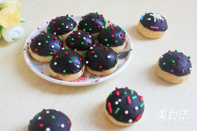 10.取一粒饼干将饼干的半边浸入融化的巧克力上,完成后表面稍微洒些装饰糖装饰即可。小胖直接用装饰糖装饰,这里还可以用各种果干、开心果、核桃仁等装饰,亲们自己选择噢!