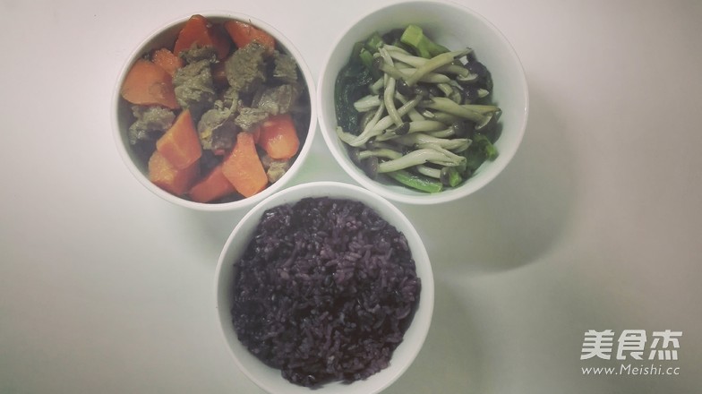 5.试一块,味道适中,肉质软糯就可以装盘了。(最后放上【一人食】的照片,分别是胡萝卜炖牛腩肉、蟹味菇炒青菜、黑米饭)