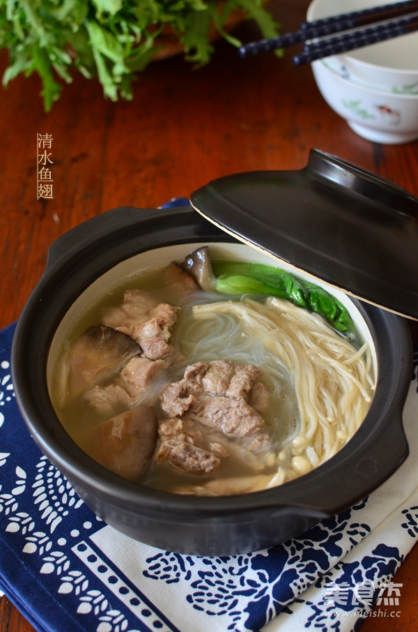 4.将砂锅中加入骨汤,开锅后将排骨及以上粉丝及蘑菇青菜放入,锅开后稍煮片刻,尝尝咸淡,加适量盐调味,就可以关火了。