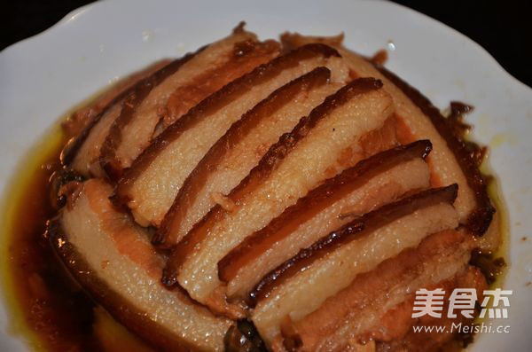 5. 肉皮向下码在小碗内,上面铺满炒好的盐菜碎,蒸锅里面水开了就可以上锅蒸了,大约蒸20分钟就好了。(吃的不叫软糯的可以久蒸一会),蒸好后反转扣到盘子里就好了。