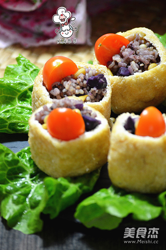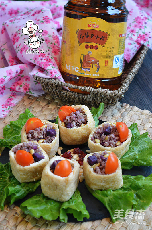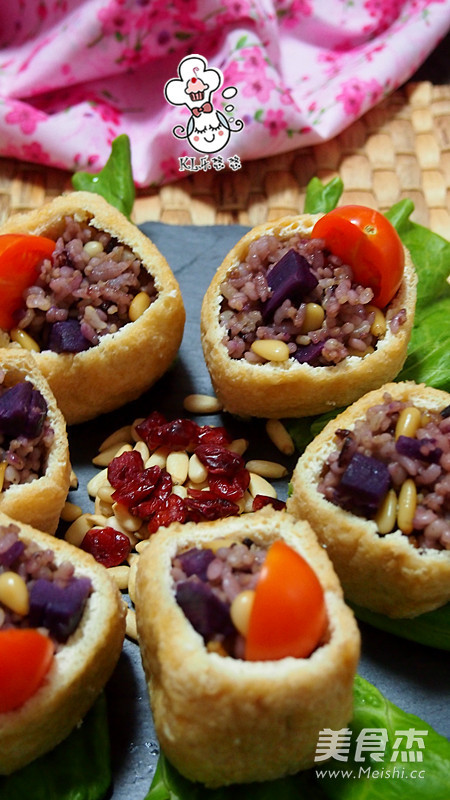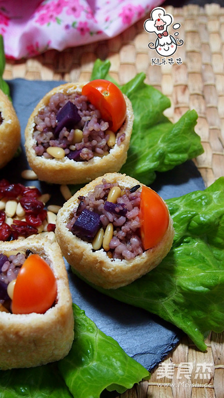 糙米40克 小米30克 高粱米30克 松仁30克 大米80克 油豆腐6个 紫薯1个 紫米20克