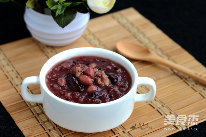 大米1/8杯 小米1/8杯 黑米1/8杯 糯米1/8杯 红米1/8杯 核桃1小把 红豆1小把 黑豆1小把 红枣8颗 花生1小把