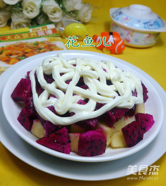 花鱼儿家的吃吃。。。 主料 苹果1只 火龙果半只 辅料 沙拉酱适量 沙拉双果的做法 1.食材:苹果、火龙果、沙拉酱 2.将苹果清洗清洗去皮,放在案板上切成小块,待用。 3.接着,将火龙果去皮,放在案板上切成小块。 4.然后,将切好的苹果和火龙果搁入盘子中。 5.最后,挤上沙拉酱,即成。