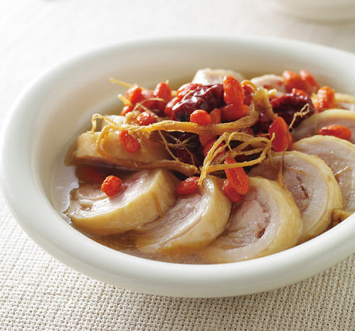 6、将作法3的猪肉排放入作法5的锅中,以小火煮约3分钟后关火泡5分钟,捞出沥干卤汁,放上葱丝和红辣椒丝(材料外)即可。