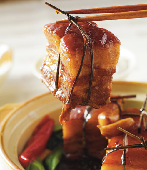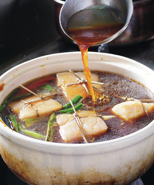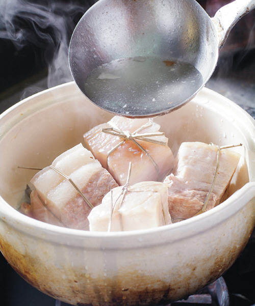 东坡肉的作法并不复杂,重点是要将辛香料爆香,一起放入卤汁中煮,可提味并去除肉腥味。