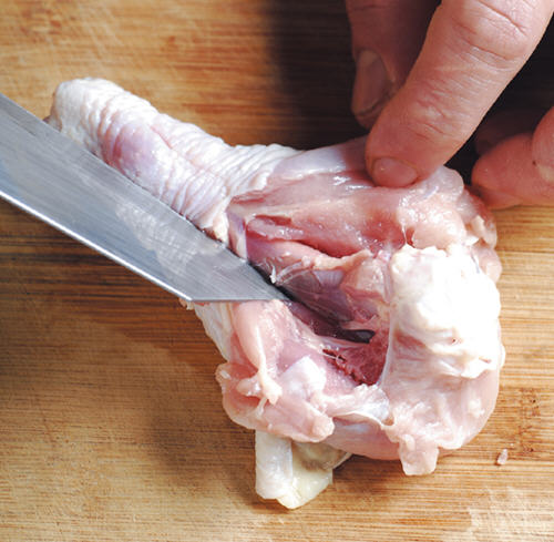 1 首先从鸡腿的侧面纵剖一刀,深度要见骨。