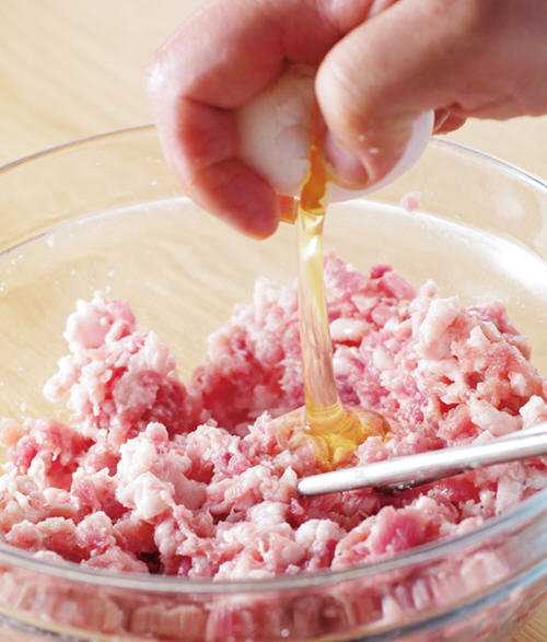 2、猪绞肉与盐混合,摔打搅拌至呈胶黏状,再依次加入作法1的材料、调味料和蛋,搅拌摔打。