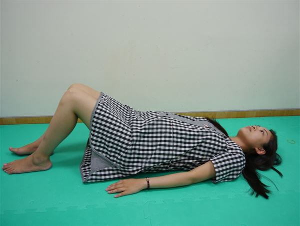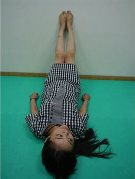身体平躺并将下肢抬高约60公分靠于墙上,可减少腰椎的屈度,放松背部肌肉,消除下肢水肿。