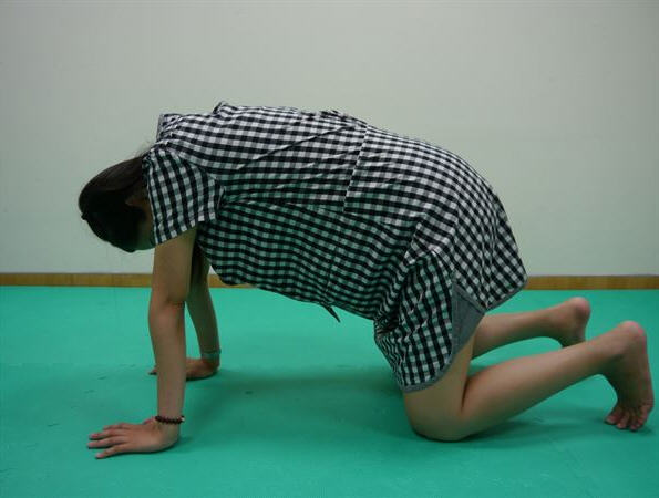(1)双脚跪在地上,膝盖90度垂直于地面,双手撑在地板与肩同宽,像猫一样将整个背部拱起来,维持5秒后放松,重覆5次,可伸展整个背部肌群。(2)跪坐在地上,将臀部慢慢往后坐到脚跟的位置,将手指往前伸以增加伸展的幅度,维持20至30秒,重覆2至3次。