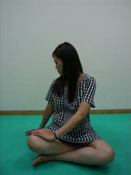 双脚自然盘坐,双手放在双脚膝盖上,吸气预备。吐气,把左手放到右膝盖,右手放身后,上半身向右扭转30度,头转向右边,下巴对齐右肩,停留3次呼吸。身体回正,换边动作。可舒缓背部的紧绷与酸痛。