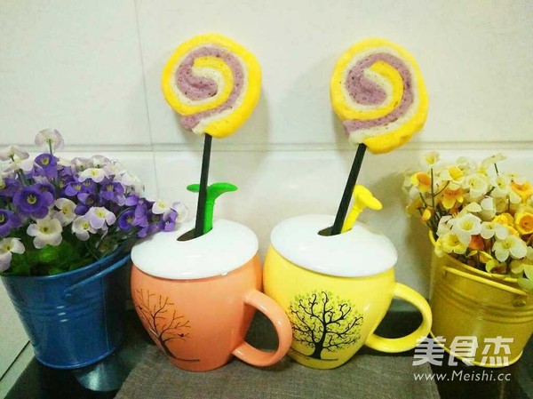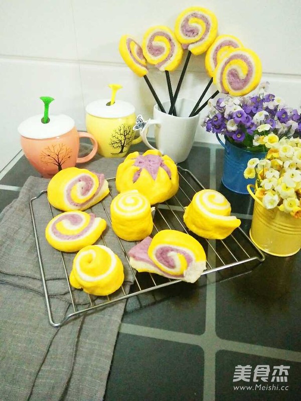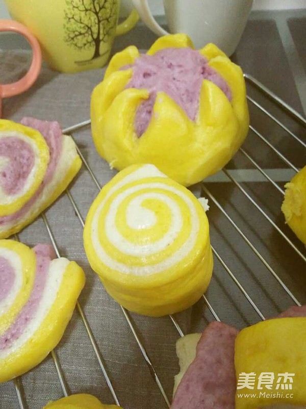 2.1.白面放入糖,奶粉。2.白面放入南瓜,糖,奶粉。3.白面放入紫薯,糖,奶粉
