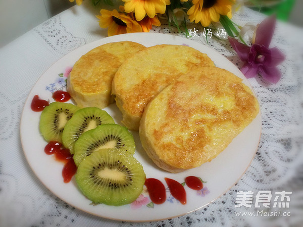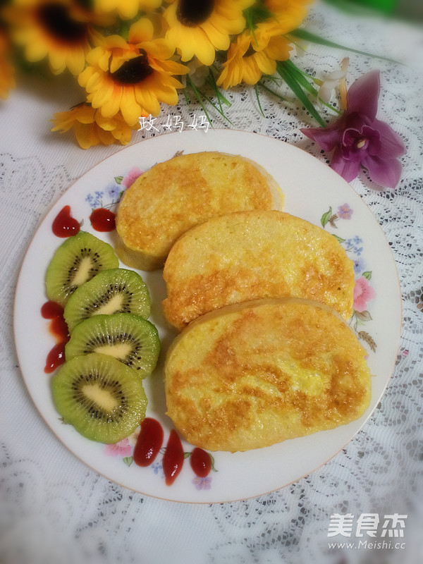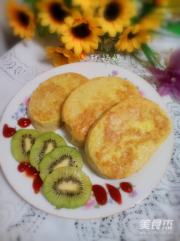 5.不粘锅加入一点油,放入沾满蛋液的馒头片小火煎制。