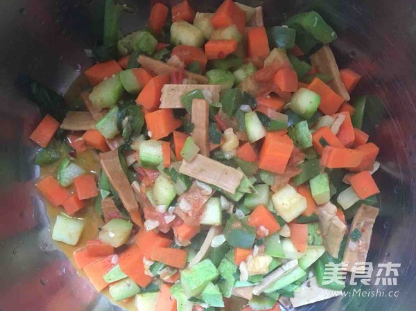 2.锅内放入适量油,把蒜爆香,放入胡萝卜丁以及西葫芦丁,炒一阵后放入青椒丁以及西红柿丁还有青菜,最后放入豆腐干以及韭菜。