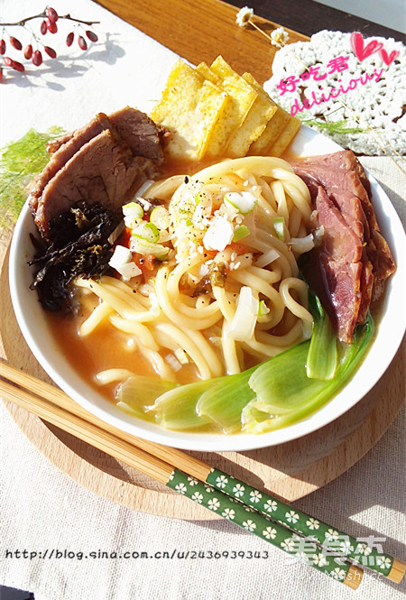 面条(生)200克 豆腐50克 油菜(小)2棵 白菜50克 紫菜10克 卤牛肉20克 牛腱子15克 洋葱20克 西红柿1个 山药10克
