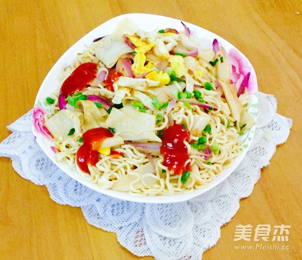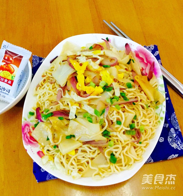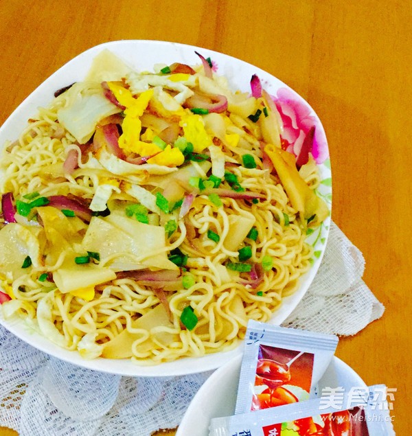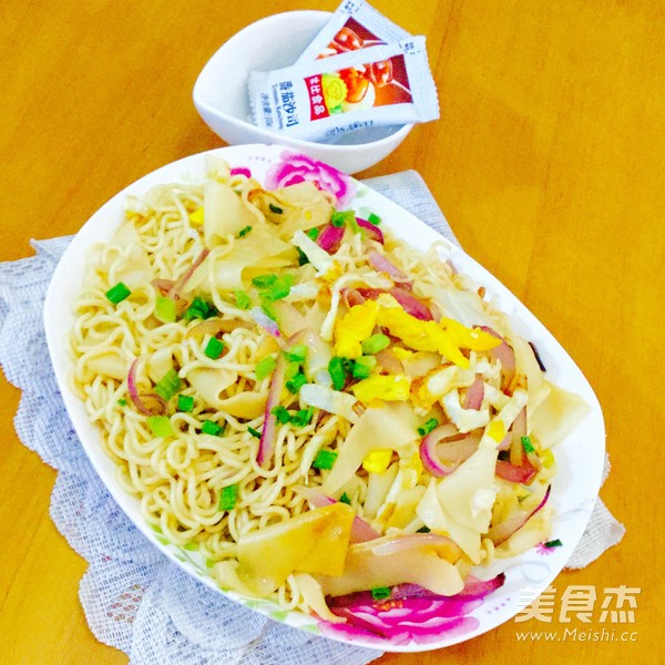 一个人的午餐 主料 面条100克 洋葱50克 鸡蛋50克 香葱5克 辅料 油15克 盐4克 酱油3克 洋葱炒面的做法 1.准备好干面条 2.用清水把面条浸软 3.准备好鸡蛋,洋葱切条,葱切葱花 4.起油锅 5.打入鸡蛋 6.两面煎好,用铲将鸡蛋切碎,盛起 7.起油锅 8.放入洋葱 9.加入葱花 10.加入面条(这里是两种面条,粗面条和细面条) 11.加入盐 12.加入洋葱、鸡蛋和葱花,加入少许酱油,翻炒均匀便可 13.出锅 烹饪技巧 面条要用冷水浸软再炒