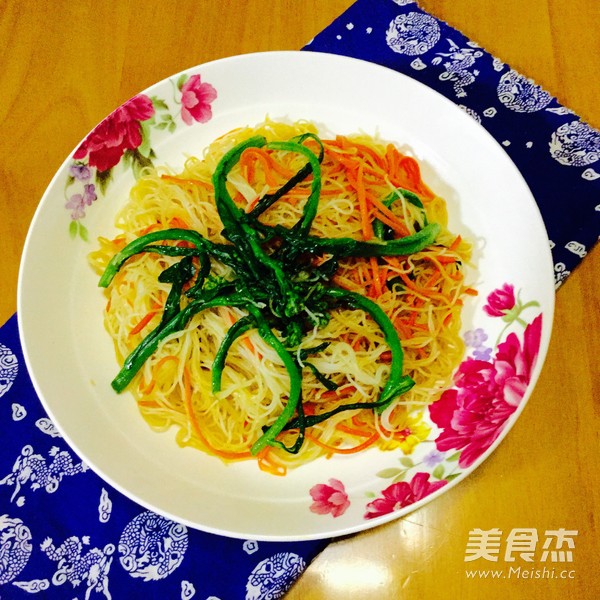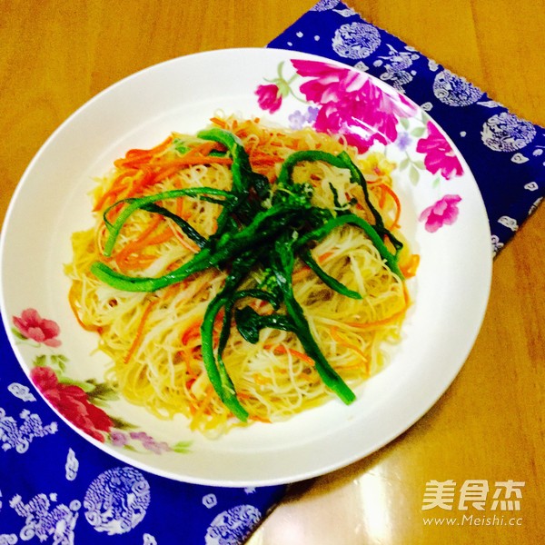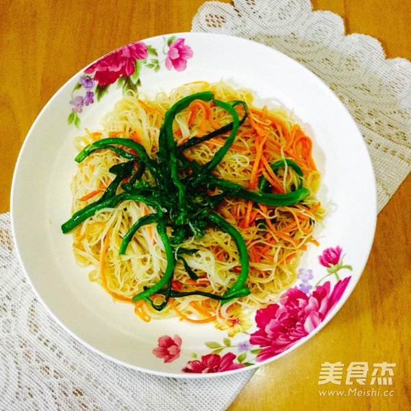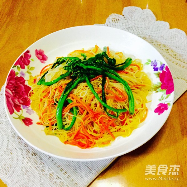11.加入菜心和胡萝卜丝,翻炒均匀
