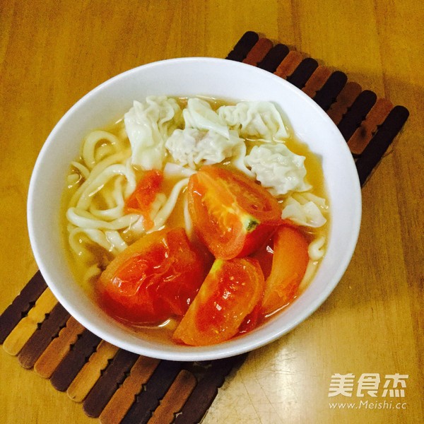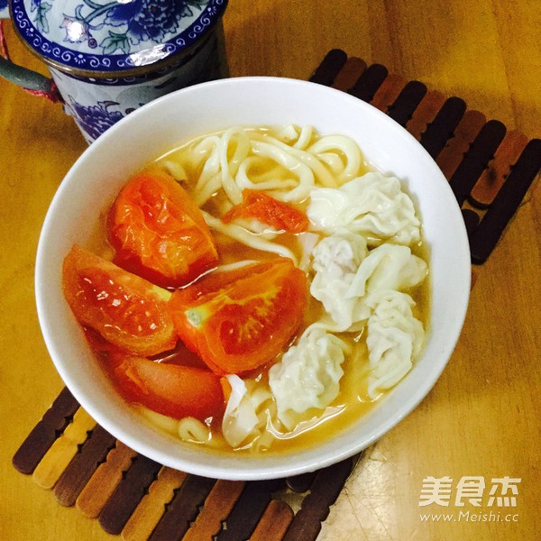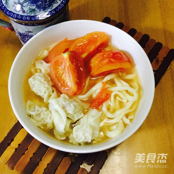 1.准备好材料,番茄切块,面条是自制的手工面,放入冷藏室的,云吞也是预先做好,放入冷藏室的,但都不用解冻