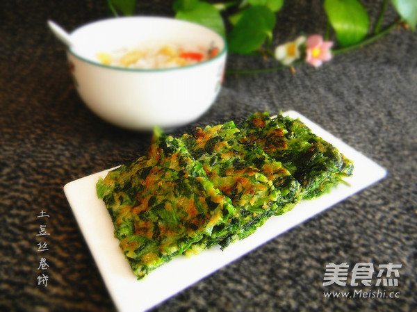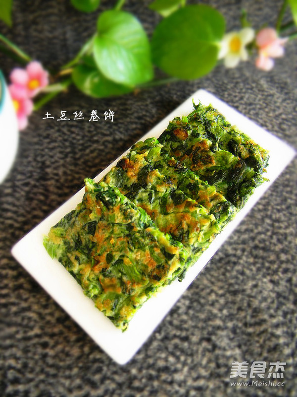 10.把拌好的菠菜面糊放入,用小勺摊平成不到半厘米后的饼状