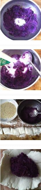 糯米紫薯饼的材料:糯米粉200克,紫薯100克,油,白芝麻,白糖,牛奶,美食网糯米紫薯饼的做法:1. 紫薯洗净,上蒸锅蒸熟,糯米粉倒入碗中,加温水,揉成光滑面团,醒置一会儿2. 蒸熟的紫薯取出过凉水去皮,捣成泥,加白糖,牛奶,捣匀的做法 3. 将醒置好的糯米粉团揉成长条,分小段,揉圆按扁,包入一点紫薯泥,揉圆按扁,成饼状,再两面沾少许水,再均匀沾上白芝麻4. 平底锅倒少许油,放入饼坯,煎至两面微黄熟透即可出锅
