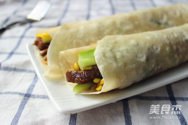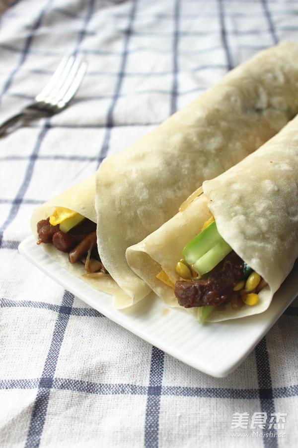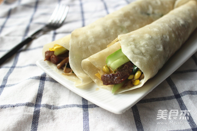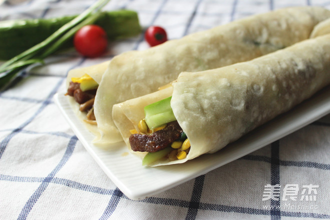 19.烙好的烙馍,卷上蛋皮丝,黄瓜条,牛肉条和蔬菜,卷紧就可以吃了,建议不要省略黄瓜条,脆嫩的口感让烙馍更好吃,别的蔬菜就根据季节来吧