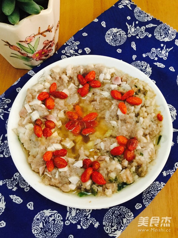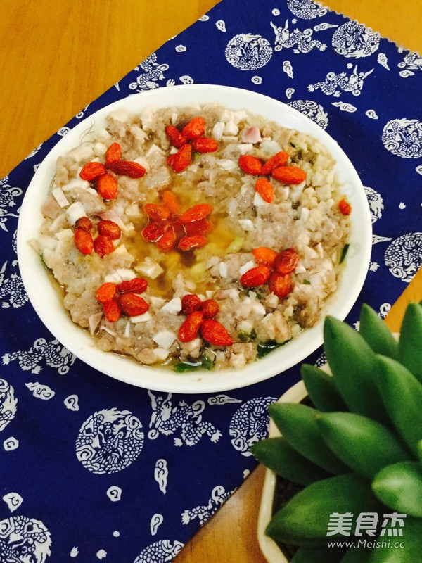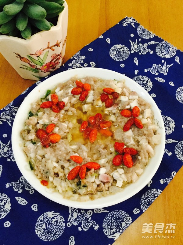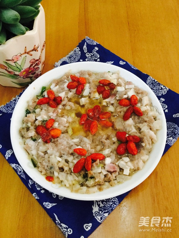 家常菜,喜欢 主料 猪肉250克 香芋100克 辅料 油10克 盐4克 蚝油3克 杞子3克 香葱5克 蒸香芋肉饼的做法 1.准备好材料 2.猪肉剁成肉饼 3.香芋去皮,切成丁,葱切葱花 4.盛起肉饼加入油、盐、蚝油和香芋丁 5.加入香葱,搅拌均匀 6.用碟盛出,摆上杞子 7.待饭滚的时候放入蒸便可 烹饪技巧 剁肉饼的猪肉最好用半肥瘦的猪肉,这样做出来的肉饼口感香滑