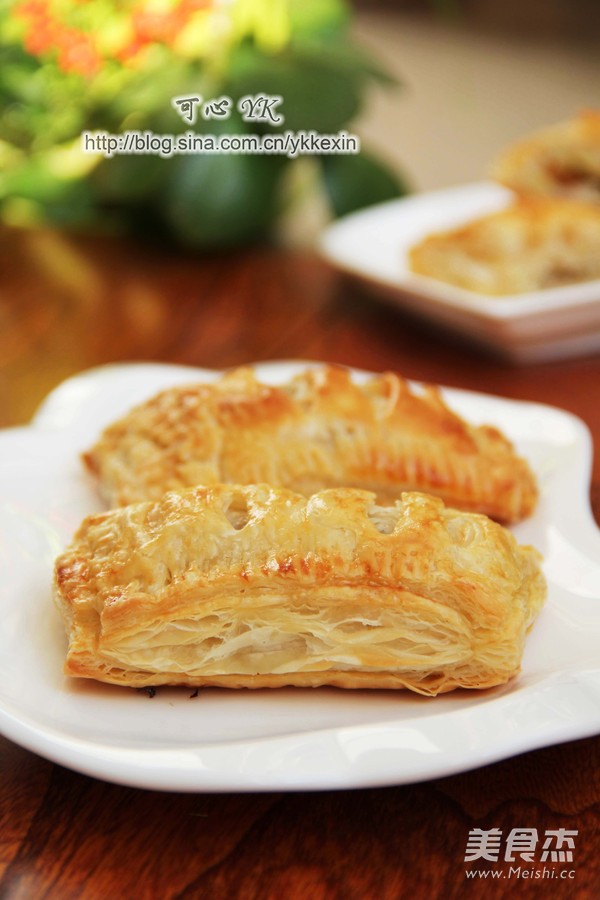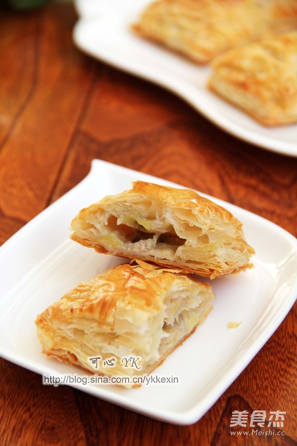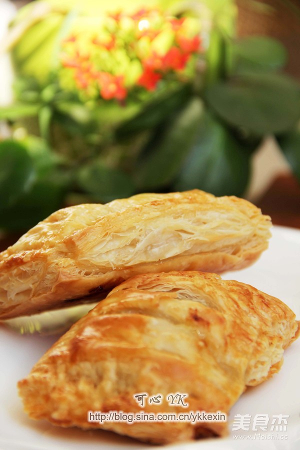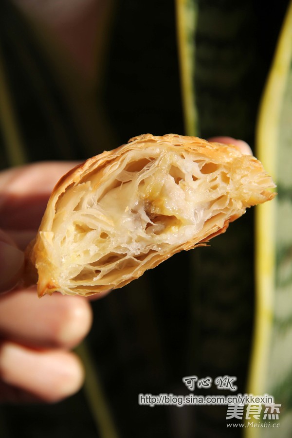 6.松弛好的派表皮涂上蛋液。烤箱190度,中层,20—25分钟,直到饼皮上色,分层明显即可