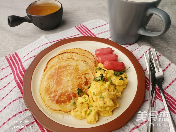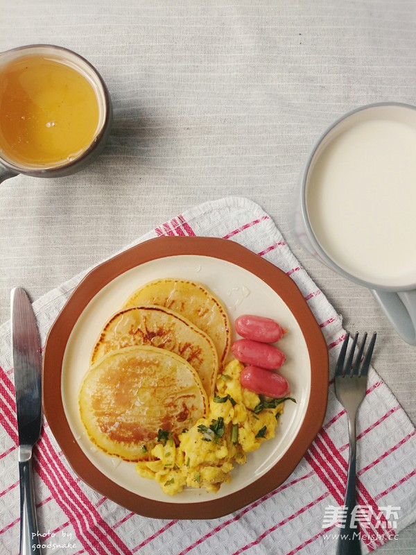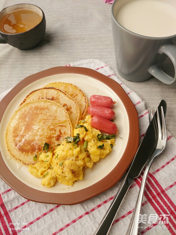 9.脆皮肠煎熟后装盘,在薄煎饼上淋上蜂蜜就可以食用了