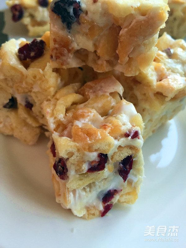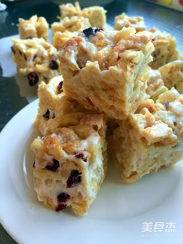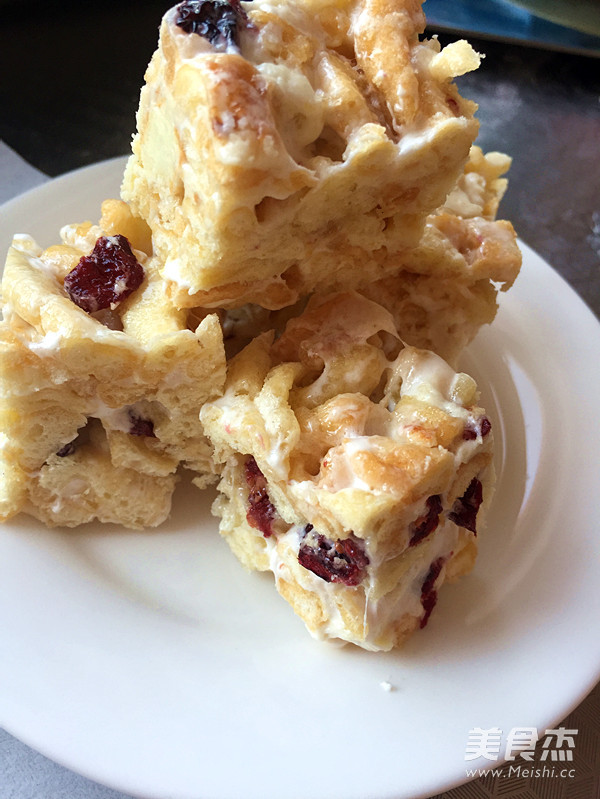 6.放入棉花糖,融化后倒入奶粉,快速搅拌均匀,关火后放入炸好的细条、蔓越莓干,快速拌匀(没来得及拍照)