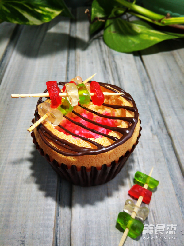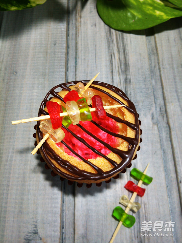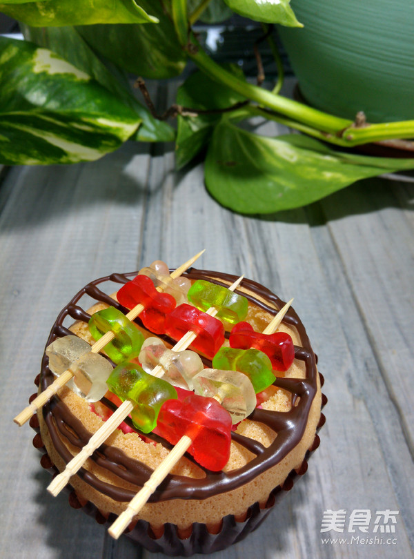 2.取两个做好的杯蛋糕,挖出少许内芯,形成杯状(杯蛋糕的做法在我的空间里已经重复过很多次了,就不再说了)如果有杯形蛋糕模具,就更方便了。将水果软糖剪成小块,用牙签穿好,模仿烤串的样子