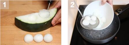 1. 用汤匙将冬瓜挖出一个个小冬瓜球(不要带皮)。出水4分钟直到冬瓜全熟,然后取出沥干,放入盘中。