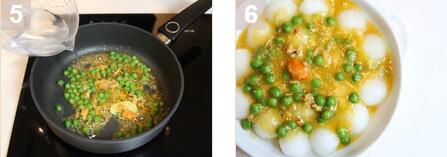 2. 在油镬中高火加热适量油。加入姜,蟹黄和青豆翻炒。加入调味料搅匀。