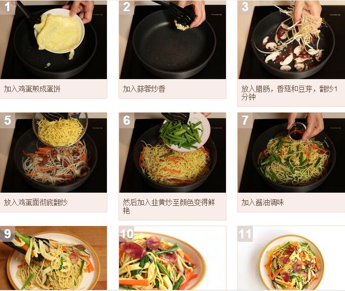 腊肠炒油面的材料:粗鸡蛋面300克,腊肠1根,韭黄40克,香菇5-6朵,红萝卜100克,豆芽100克,鸡蛋1个,蒜1粒,水100mL。酱油2汤匙。鸡粉1/4茶匙 腊肠炒油面的做法: 1. 在油镬内中火加热适量油,加入鸡蛋煎成蛋饼。 2. 在相同的油镬中,加入蒜蓉炒香,放入腊肠,香菇和豆芽,翻炒1分钟。 3. 加入红萝卜和水,加入鸡粉调味并且搅匀。 4. 放入鸡蛋面彻底翻炒,然后加入韭黄炒至颜色变得鲜艳,约需时2分钟。 5. 加入酱油调味,最后加入蛋饼丝就可以了。