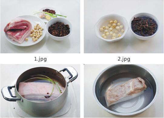 莲蓬扣肉的材料:五花肉500g、梅干菜100g、莲子50g,姜、葱、蒜、老抽酱油1匙、生抽1匙、料酒1匙、白糖、冰糖3个、八角一个、香叶一片