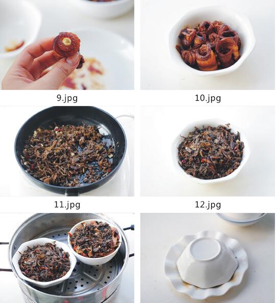5、锅内热油放姜、蒜、干红辣椒爆香,将沥干水份的梅干菜,放入炒香.加入少量白糖,生抽调味,再将炒香的梅干菜,铺上肉卷表面,用压紧实,将碗放入蒸锅中,中火蒸60分钟左右即可。