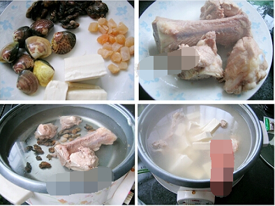 2.将筒骨,海鲜干货一起入电炖锅煮开,转小火慢熬一小时