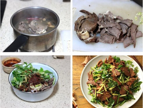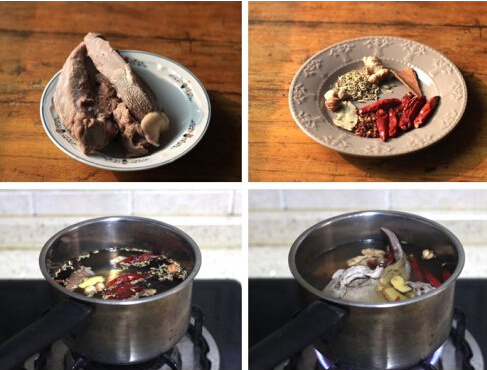 3、先把上面的清卤材料用水熬煮20分钟,放入收拾好的猪舌,大火烧开后,转小火卤煮30分钟,取出来,凉了后切片;
