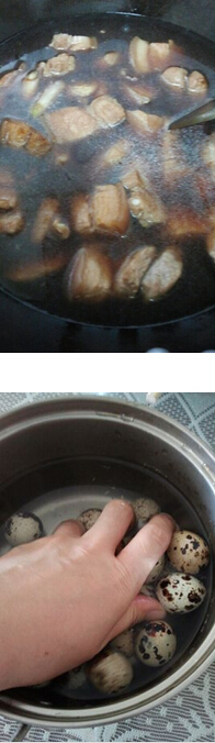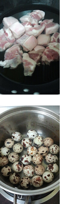 1.五花肉焯水,鹌鹑蛋洗净放锅煮熟,可以放一点盐进去,这样煮的时候不容易破。