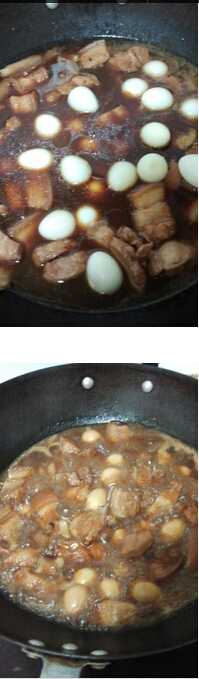 5.肉烧到半小时左右放入鹌鹑蛋,烧开后转小火,再烧20分钟左右,用筷子插肉,能轻轻穿透后,用大火收汁,撒上葱花,装盘。