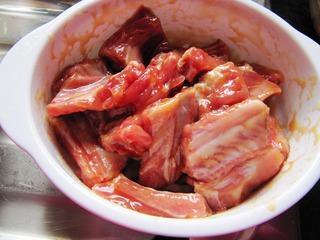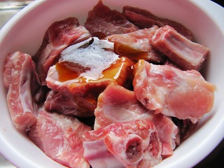 3、往排骨里加入叉烧酱。