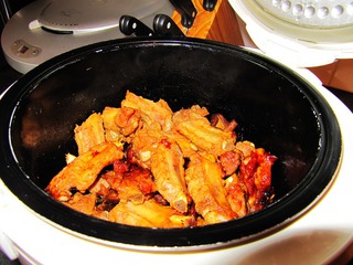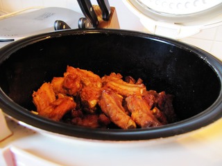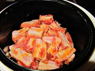 5、取出腌制过的排骨,然后整齐码入电饭锅内。