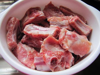 1、新鲜排骨,斩成中等大小块状,用清水反复泡洗干净;并滤干水分,装入碗里。