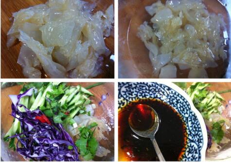 陈醋海蜇头的材料:海蜇头500克,黄瓜一条,紫甘蓝1/4个,香菜,泰椒,陈醋,生抽,白砂,糖,芝麻油,辣油陈醋海蜇头的做法:1:海蜇头清洗干净,浸泡8小时以上,在浸泡的时候至少要换水2-3次 2:锅中倒水烧6成热即可,放入海蜇头迅速汆烫5秒钟,捞出过冷水怎么做好吃3:黄瓜用盐搓洗干净切条,甘蓝洗净切丝 也放入盛放海蜇的碗中,然后摆上泰椒碎,香菜碎备用4:取另个容器,放入陈醋、酱油、白砂糖、芝麻油、辣油,调均匀,然后倒入海蜇碗中拌匀 即可食用