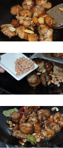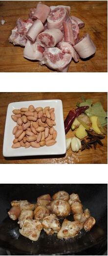花生焖猪尾的材料:猪尾 (一只),花生,姜蒜,盐,八角,辣椒,香叶,米酒,清水,鸡精 花生焖猪尾的做法: 1.猪尾洗净斩块。 2.锅里放油,炒糖色,然后放入猪尾炒均,放入姜蒜炒香,接着放入花生翻炒片刻,放入香叶 八角 辣椒炒香,放入适量的盐炒均,放入一小碗米酒炒均,最后放入清水煮至收汁,放入鸡精调味即可。 的做法