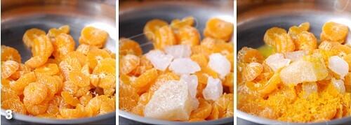 3.果肉放入锅里,加冰糖,倒入橘皮泥,大火煮开后转小火继续煮